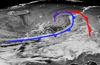 Das Orkantief 'Tilo' befindet sich am Donnerstag Mittag über der Nordsee. Seine Warmfront hat dabei Norddeutschland und Dänemark schon mit Wolken und etwas Regen erreicht. Die Kaltfront erstreckt sich vom Atlantik über die Britischen Inseln bis in den Westen Norwegens. Sie zieht nun rasch nach Mitteleuropa weiter und leitet hier einen sehr windigen und feucht-kühlen Witterungsabschnitt ein. (Bildquelle: NERC Satellite Receiving Station, Dundee University, Scotland, http://www.sat.dundee.ac.uk/)