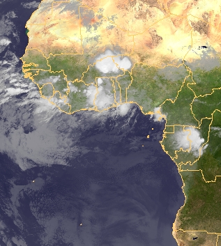 An der Westküste Afrikas haben sich kräftige Schauer und Gewitter entwickelt. Diese entstehen jahreszeitlich bedingt in Zusammenhang mit der innertropischen Konvergenz.