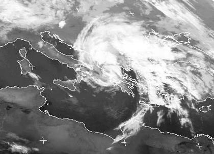 Der Ausschnitt zeigt ein Tief über Griechenland, das dort zum Teil starke Niederschläge verursacht. Auf seiner Vorderseite wird warme und relativ trockene Luft über das Mittelmeer nach Norden geführt und nimmt dabei viel Feuchtigkeit auf. Diese geht dann über dem Festland als teils starker Regen nieder.