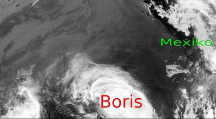 Nur einige 100km südwestlich von der mexikanischen Pazifikküste entwickelte sich am Freitag Sturmtief 'Boris'. Er hat sich seitdem noch deutlich verstärkt und ist weiter nach Westen gezogen. Zur Zeit erreicht er Mittel Windgeschwindigkeiten um 112 Stundenkilometer und liegt damit noch unterhalb der Hurricangeschwindigkeit von 119 km/h. Er zieht in den nächsten Tagen noch weiter Richtung Westen und soll nach Berechnungen Morgen seine höchsten Windgeschwindigkeiten um 120 km/h im Mittel erreichen, in Böen sind Windgeschwindigkeiten bis 150 km/h nicht auszuschließen.