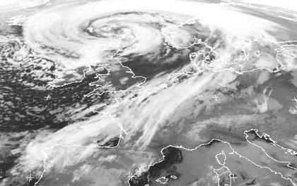 Das Sturmtief 'Gero' nähert sich vom Atlantik her und sorgt ab Morgen für Wetterumstellung in Europa. Seine Kaltfront (auf dem Satellitenbild erkennt man sie sehr gut) überquert heute Deutschland, Frankreich und Polen und verlagert sich unter Abschwächung weiter nach Osten. Dahinter fließt mit einer westlichen Strömung feucht-kühle Meersluft zu uns ein.