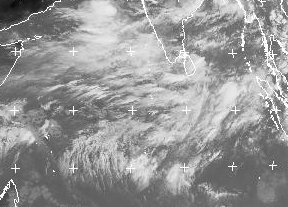 Vor der Südwestküste Indiens zeigt sich durch die Anordnung der Wolken der Strömungsverlauf der Passatwinde, die verantwortlich sind für den Sommermonsun. Nördlich des Äquators dreht der Wind auf eine südwestliche Richtung, nimmt über den Indischen Ozean Feuchtigkeit auf und sorgt so für die starken Regenfälle in der Sommermonaten über Indien (Bildquelle: http://www.eumetsat.int/Home/Main/Image_Gallery/Real-time_Images/index.htm)