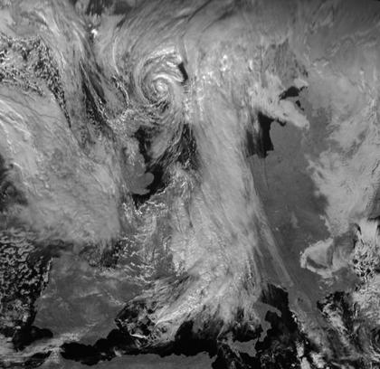 Der Kern des Tiefs 'Berti' liegt in dem Wolkenwirbel, der auf dem Satellitenbild vom Montagmittag über der nördlich Nordsee zu erkennen ist. Ausläufer des Tiefs erstrecken sich mit einem breiten und dichten Wolkenband von Skandinavien über Deutschland hinweg bis zu einem weiteren Tief über Italien. Vom Atlantik her ziehen bereits die dichten Wolkenfelder weiterer Tiefs nach Westeuropa.