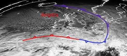 Das Tief 'Birgitta' nahe Island hat Samstag Mittag mit seinen Fronten Mitteleuropa und auch Deutschland erreicht. Besonders über Frankreich und hinaus auf den Atlantik liegen dichte Wolken, die einigen Regen bringen. Quer über Deutschland liegt Okklusionsbewölkung, die kalte Luft im Osten von warmer im Westen trennt. Im Frontbereich fällt Regen (in den höheren Luftschichten ist es schon wärmer), der am Boden bei teils noch frostigen Temperaturen gefährliche Rutschpartien durch Blitzeis verursachen kann. (Bildquelle: NERC Satellite Receiving Station, Dundee University, Scotland, http://www.sat.dundee.ac.uk/)
