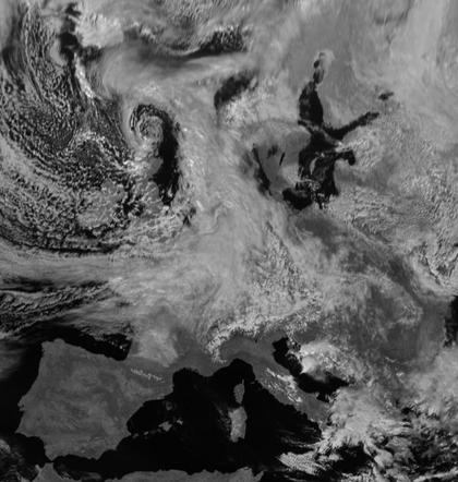 Nördlich von Schottland erkennt man auf dem Satellitenbild vom Donnerstagmittag das Zentrum von Tief 'Jens'. Sein Frontensystem mit dichten Wolken zieht von Westen nach Deutschland. Dahinter folgt von Westen über den Britischen Inseln ein Gebiet mit vielen lockeren Schauerwolken.