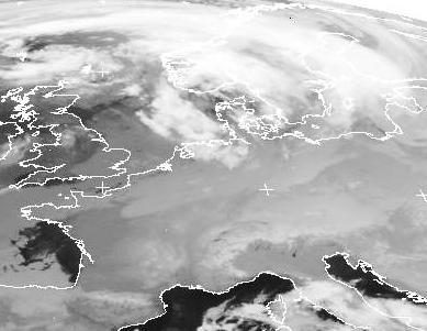 Am Sonntagmorgen steht die Milderung in Form eines Ausläufers von Tief 'Michael' schon vor der Tür. Mit etwas Mühe erkennt man eine Wolkenschicht über den Mittelgebirgen und Norddeutschland. Sie unterscheidet sich farblich nur wenig von dem frei sichtbaren Boden südlich des Mains, denn die Temperatur ist gleichermaßen niedrig. Dennoch sind diese Wolken von Wirkung. Sie gehören zu einer Warmfront, die sich in einem Bogen vom Atlantik über Skandinavien und die Ostsee bis nach Deutschland erstreckt. Dahinter strömt deutlich mildere, und sehr feuchte Meeresluft heran. Die Temperatur liegt in der neuen Luftmasse schon deutlich über den Gefrierpunkt, direkt in der Frontalzone droht also gefährlicher Eisregen.