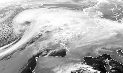 Westlich der Britischen Inseln liegt das Zentrum von Tief 'Nino', dessen Warmfront Wolken und Regen bis nach Norddeutschland bringt. Seine Kaltfront ist als dünneres Wolkenband auf dem Atlantik zu erkennen. Auf ihrer Rückseite bilden sich Schauer. Tief 'Nino' bringt heute zudem Sturm mit Orkanböen nach Irland und Schottland.