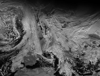 Auf dem Satellitenbild sind über dem Nordatlantik die Tiefdruckgebiete 'Quintus' und 'Ronny' an der Schichtbewölkung der Warmfront und an der zellulären Bewölkung der labilisierten Kaltluft erkennbar. Tief 'Quintus' bringt Mitteleuropa weiterhin dichte Bewölkung und Niederschlag.
