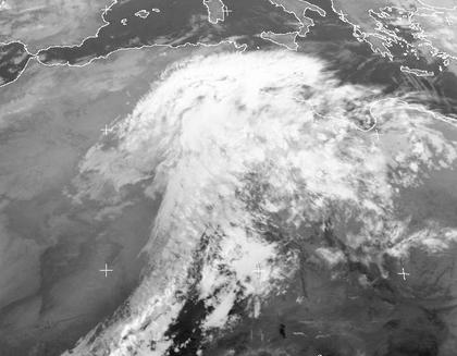 Über der nördlichen Sahara, zwischen Algerien und Libyen liegt ein ausgedehntes Tiefdruckgebiet. Seine Kaltfront ist als langes Wolkenband zu erkennen, das bis in die Tropen reicht. Regen fällt allerdings hauptsächlich in Algerien und Libyen. Das Tief wird sich langsam weiter in Richtung östliches Mittelmeer bewegen.