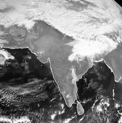 Weite Teile Indiens sind wolkenfrei. Über dem Nordosten zieht jedoch ein kleines Tief mit dichteren Wolken durch. In Indien bringt es meist Regen, in den Bergen Tibets fällt dagegen Schnee. (Bildquelle: NERC Satellite Receiving Station, Dundee University, Scotland, http://www.sat.dundee.ac.uk/)