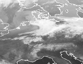 Das kleine Tiefdruckgebiet 'Uschi' liegt am Samstagmorgen genau über Deutschland. Man erkennt sehr gut die Kaltfront, die sich in einem Bogen in Richtung Belgien und Frankreich erstreckt. Der gesamte Warmsektor des Tiefs wird von hohen, auf dem Bild hellen Wolken überdeckt. An der See und in Schleswig-Holstein liegt eine kühlere Luftmasse, in der sich jedoch teilweise flache, auf dem Bild etwas dunklere Wolkenfelder gebildet haben.