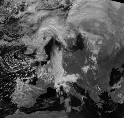 Ein Ausläufer von Tief 'Ingeborg' über den Britischen Inseln liegt mit dichten Regenwolken über Westdeutschland. Der Ausläufer trennt warme Luft im Osten von deutlich kühlerer im Westen. Im Bereich dieses Ausläufers hat sich zudem ein neues Tief gebildet, das nun mit den Regenwolken nordostwärts über Deutschland hinwegzieht.