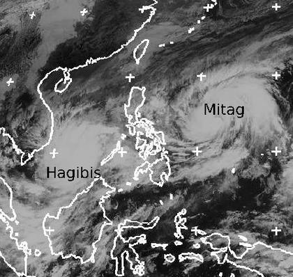 Der Sturm 'Mitag' liegt mit mittleren Windgeschwindigkeiten bis 100 km/h und Böen bis 130 km/h noch östlich der Philippinen. Er zieht auf den Norden der Inselgruppe zu, die er am Freitag oder Samstag erreichen wird. Er verstärkt sich noch, möglicherweise erreicht er auch Taifunstärke.