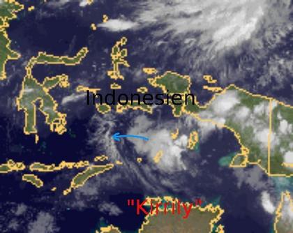Der Tropensturm 'Kirrily' liegt weiter über einigen Inseln von Indonesien, bleibt aber bei Windgeschwindigkeiten von75 km/h im Mittel und 95 km/h in Böen eher schwach. 'Kirrily' zieht nach Westen weiter, verstärkt sich aber weiterhin nicht. Es sorgt aber für einigen Regen über Teilen von Indonesien.
