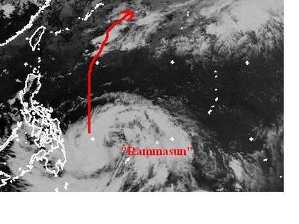 Im Pazifischen Ozean, südöstlich der Philippinen hat sich der tropische Sturm 'Rammasun' aufgewirbelt. Zurzeit erreicht er nur mittlere Windgeschwindigkeiten von 74, in Böen 92 km/h, Berechnungen zufolge soll er sich aber weiter verstärken und zum Taifun entwickeln. Sein Endziel ist allerdings noch unklar. (Bildquelle: NERC Satellite Receiving Station, Dundee University, Scotland, http://www.sat.dundee.ac.uk/)