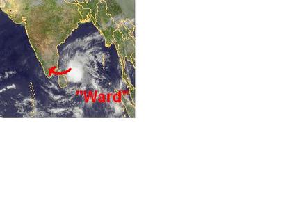 Auf dem Satellitenbild von Sonntag früh ist der Tropensturm 'Ward' östlich von Sri Lanka gut zu erkennen. Zur Zeit erreicht er mittlere Windgeschwindigkeiten von 83, in Böen 102 km/h. Berechnungen zufolge soll er über dem Norden von Sri Lanka weiter nach Westen ziehen, sich etwas Abschwächen, und am Dienstag auf die Südostküste von Indien treffen. Sein Endziel ist allerdings noch unklar.