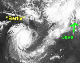 Im Indischen Ozean hat sich westlich der Indonesischen Insel Java ein tropischer Wirbelsturm gebildet. Zur Zeit ereicht er Windgeschwindigkeiten von 150, in Böen 185 km/h und zieht in südwestlicher Richtung. Inseln liegen voraussichtlich nicht in seiner Zugbahn.