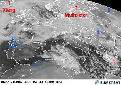 Auf dem heutigen Satellitenfoto sind besonders über den Britischen Inseln, über Mitteleuropa und Nordeuropa meist dichte Wolken zu sehen, die zu zwei Tiefdruckgebieten 'Xiang' bei Island und 'Wulfdieter' über der Ostsee gehören. In diesen Gebieten kommt es zeitweise oder auch häufig zu Regen-, teils auch zu Schneefällen. Freundlicher und überwiegend trocken bei nur einzelnen Regenfällen ist es im Osten Europas. Am freundlichsten ist es aber auf der Iberischen Halbinsel, sowie in Großteilen des westlichen Mittelmeerraums. Im östlichen Mittelmeer sorgt Tiefdruckeinfluss dagegen für teils kräftige Schauer und Gewitter.