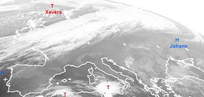 Auf dem heutigen Satellitenfoto ist ein zum Sturmtief 'Xevera' gehörendes breites Wolkenband zu erkennen, das vom Atlantik über England und Nordfrankreich, den Beneluxstaaten, den Norden Deutschlands, die Ostsee bis einschließlich Finnland reicht. In diesen Regionen fällt heute meist anhaltender Regen und es lockert kaum auf. Nordwestlich dieses Wolkenbandes herrscht meist kühles Schauerwetter mit einigen Auflockerungen und teils kräftigen Schauern und auch einzelnen Gewittern. Südöstlich des Wolkenbandes ist es bei einigen Wolken, teils heiter und bis auf einige Ausnahmen am Mittelmeer und am Schwarzen Meer ist es meist trocken.