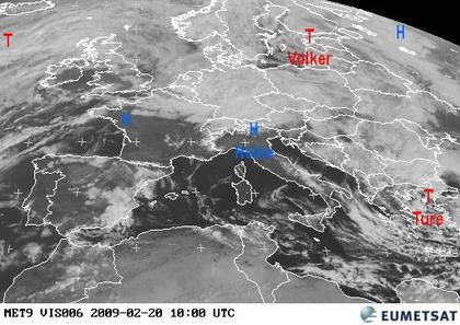 Auf dem heutigen Satellitenfoto zeigt sich besonders der Norden, die Mitte, sowie der Osten und Südosten Europas häufig wolkenverhangen. Dabei sorgt besonders Tief 'Ture' am östlichen Mittelmeer für teils kräftige Schauer, teils auch für Gewitter, sonst regnet es meist nur leicht und teils bleibt es auch trocken. Deutlich freundlicher zeigt sich das Wetter dagegen von der Iberischen Halbinsel zum zentralen Mittelmeer und ebenso in Frankreich, hier bleibt es bei meist nur lockeren Wolkenfeldern auch überwiegend trocken.