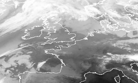 Von England bis nach Deutschland gibt es kaum Bewölkung. In Norddeutschland erkennt man flache Bewölkung, die nur sehr wenig Regen bringt. Westlich der Britischen Inseln ist bereits die Bewölkung der Kaltfront zu sehen, auf deren Vorderseite ab Montag Abend Gewitter in Deutschland entstehen. Auf ihrer Rückseite ist mit einer deutlichen Abkühlung zu rechnen.