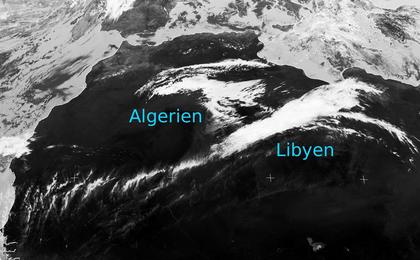 Deutlich heben sich die im Infrarot-Satellitenbild von Mittwoch Mittag die hell dargestellten Wolken (mit kühler Temperatur) von der dunkel dargestellten Erdoberfläche (mit warmer Temperatur) ab. Ein Wolkenband reicht dabei in zerfledderter Strukur bis nach Mauretanien an der Atlantikküste. Die Wolken gehören zu einer schwachen Tiefdruckstörung, bringen aber nur in Libyen unergiebigen Regen. (Bildquelle: NERC Satellite Receiving Station, Dundee University, Scotland, http://www.sat.dundee.ac.uk/)