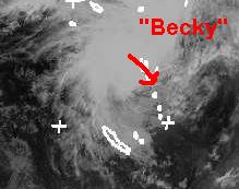 Das Satellitenbild von Dienstag früh zeigt den Zyklon 'Becky' nahe der Neuen Hebriden im Südpazifik. Der Zyklon liegt derzeit noch etwas nördlich der Neuen Hebriden und erreicht mittlere Windgeschwindigkeiten von 100, in Böen 130 km/h. Berechnungen zufolge soll er sich noch etwas verstärken und direkt über die Inseln nach Süden ziehen. Dabei muss neben Sturm auch mit ergiebigen Regenmengen auf den Inseln gerechnet werden. (Bildquelle: NERC Satellite Receiving Station, Dundee University, Scotland, http://www.sat.dundee.ac.uk/)