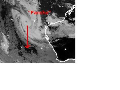 Auf dem Satellitenbild von Donnerstag früh ist das Auge des Zyklons 'Pancho' vor der Nordwestküste Australiens gut zu erkennen. Zurzeit erreicht er mittlere Windgeschwindigkeiten von 158, in Böen 195 km/h. Berechnungen zufolge soll er sich nicht weiter verstärken und Richtung Süden ziehen. Die Australische Westküste wird voraussichtlich überwiegend von 'Pancho' verschont bleiben. (Bildquelle: NERC Satellite Receiving Station, Dundee University, Scotland, http://www.sat.dundee.ac.uk/)