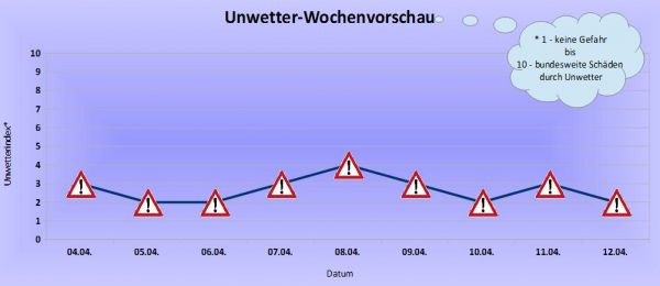 Die kommende Wetterwoche steht ganz im Zeichen des Frühlings, wobei es dazu jedoch auch oft wechselhaft bleibt, jedoch bedeutet dies auch immer wieder sonnige Abschnitte. Insgesamt bleiben die Wetterrisiken überschaubar, die Nächte sollten frostfrei bleiben und der Wind dürfte überwiegend schwach bis mäßig und nur selten frisch wehen. Die größte Gefahren sind jedoch lokal auftretende, weitgehend kurze Gewitter, dabei ist auch mal mit Hagel und böigem Wind zu rechnen. Insgesamt bleibt es aber ein recht ruhige Woche.