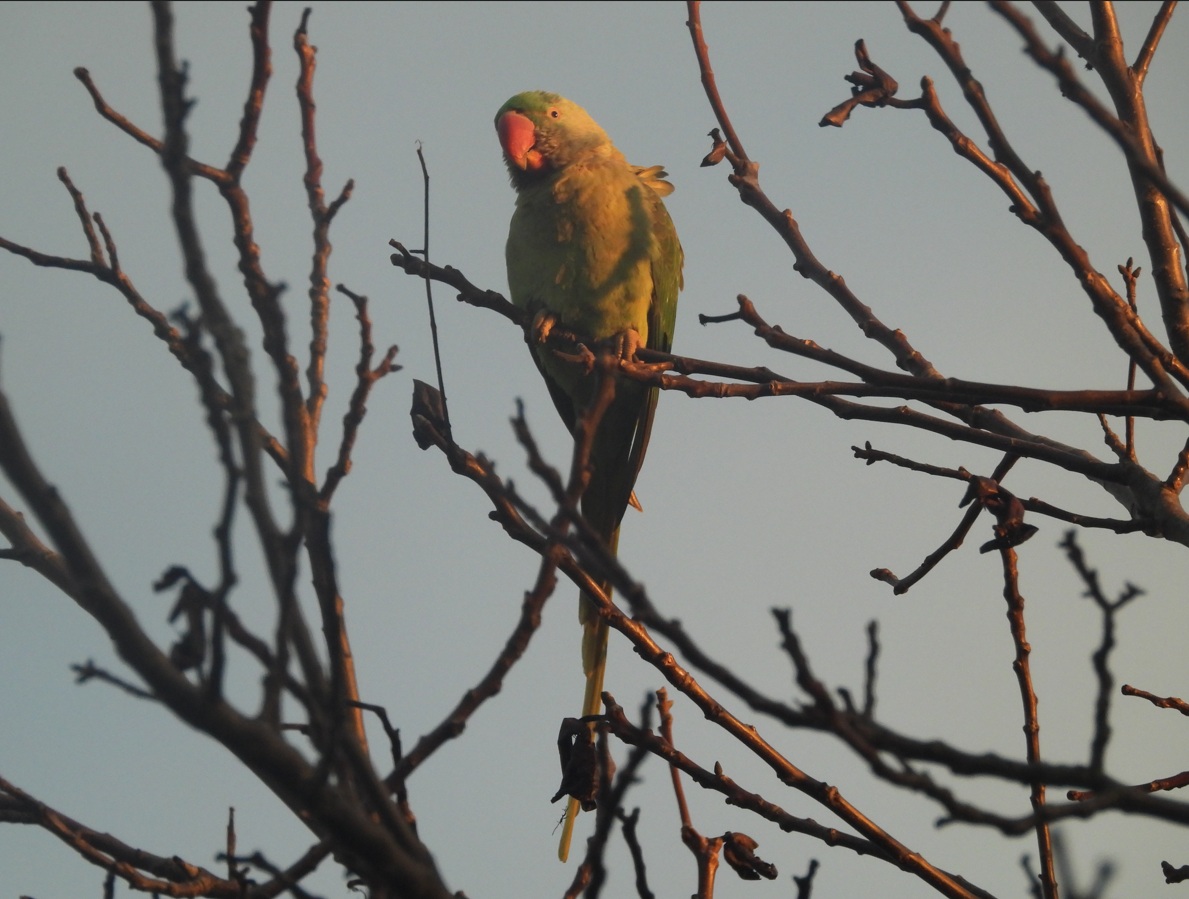 Wir staunten nicht schlecht, als wir heute früh diese "Halsbandsittich-Vollversammlung" auf einem Baum in einem ruhigen Wohngebiet entdeckten. Etwa 20 giftgrüne Exemplare ließen sich im auf dem kahlen Geäst beobachten.