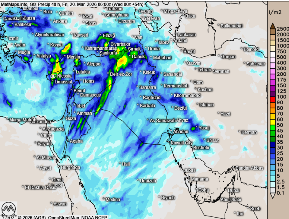 Durch das Sturmtief, das morgen über Syrien und die Türkei zieht, können jedoch Partikel im Nahen Osten verstärkt abregnen – insbesondere über dem Irak und Iran, teilweise auch über der Türkei und Syrien. Die Wetterlage ist von Sturmböen und starkem Regen geprägt.