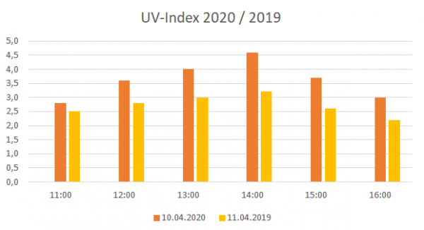 Besonders am frühen Nachmittag sind die Strahlungswerte wesentlich höher, wie der direkte Vergleich des UV-Index zeigt.