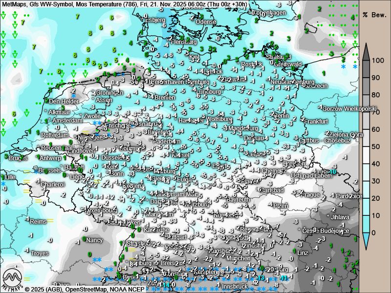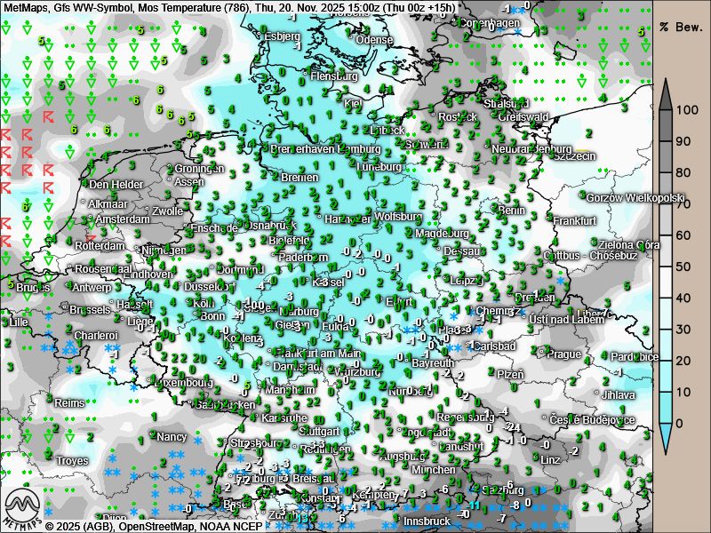 Die Schneehöhenkarte und Temperatur- / Wetterkarte für Donnerstagnachmittag (15:00 Uhr) sowie die Wetter- / Temperaturkarte für Freitagfrüh (06:00 Uhr) nach GFS: