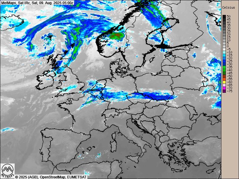 Die hohen und mittelhohen Wolken, gut zu erkennen auf diesem Satellitenbild, dämpfen heute die Temperaturentwicklung tagsüber ein wenig: