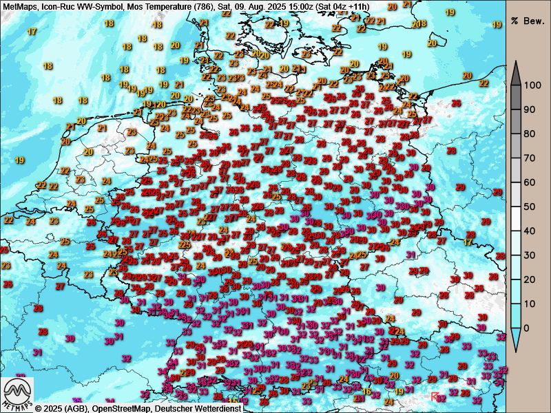 Die Temperaturen der Wolkenoberflächen (Eiswolken) sowie die nach ICON für Samstagnachmittag berechneten Höchsttemperaturen könnt Ihr den beiden folgenden Karten entnehmen: