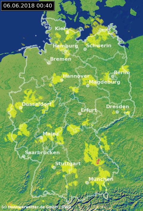 Das Radarbild zeigt aktuell zwar schwache Signale, Regen fällt jedoch daraus nicht. Nur über Bayern erkennt man eine kleine Schauerzelle, die sich jedoch bald auflösen sollte. Sonst präsentiert sich der Himmel über Deutschland überwiegend leicht bewölkt oder sternenklar.