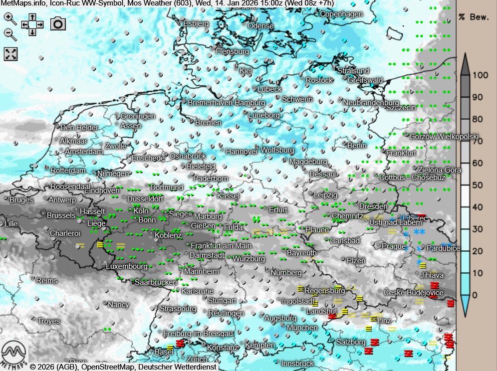 Die Wetter- und Temperaturkarte für 15:00 Uhr nach ICON-RUC: