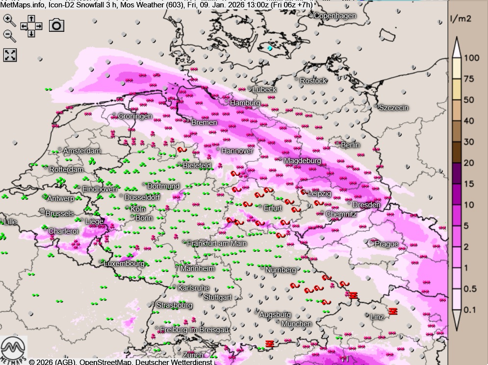Die 3-Stunden-Schneemengen / Wetter für Deutschland sowie die Sechs-Stunden-Schneemengen für Berlin bis 13:00 Uhr nach ICON-D2: