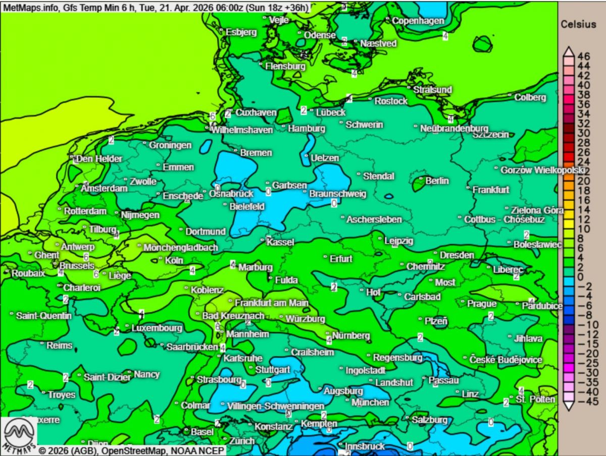 In den kommenden Nächten müssen Autofahrer und Hobbygärtner hierzulande nochmals wachsam sein: Während die Lufttemperaturen in zwei Metern Höhe verbreitet zwischen -1 °C und +4 °C liegen, sinken die Werte direkt über dem Erdboden stellenweise deutlich unter den Gefrierpunkt.