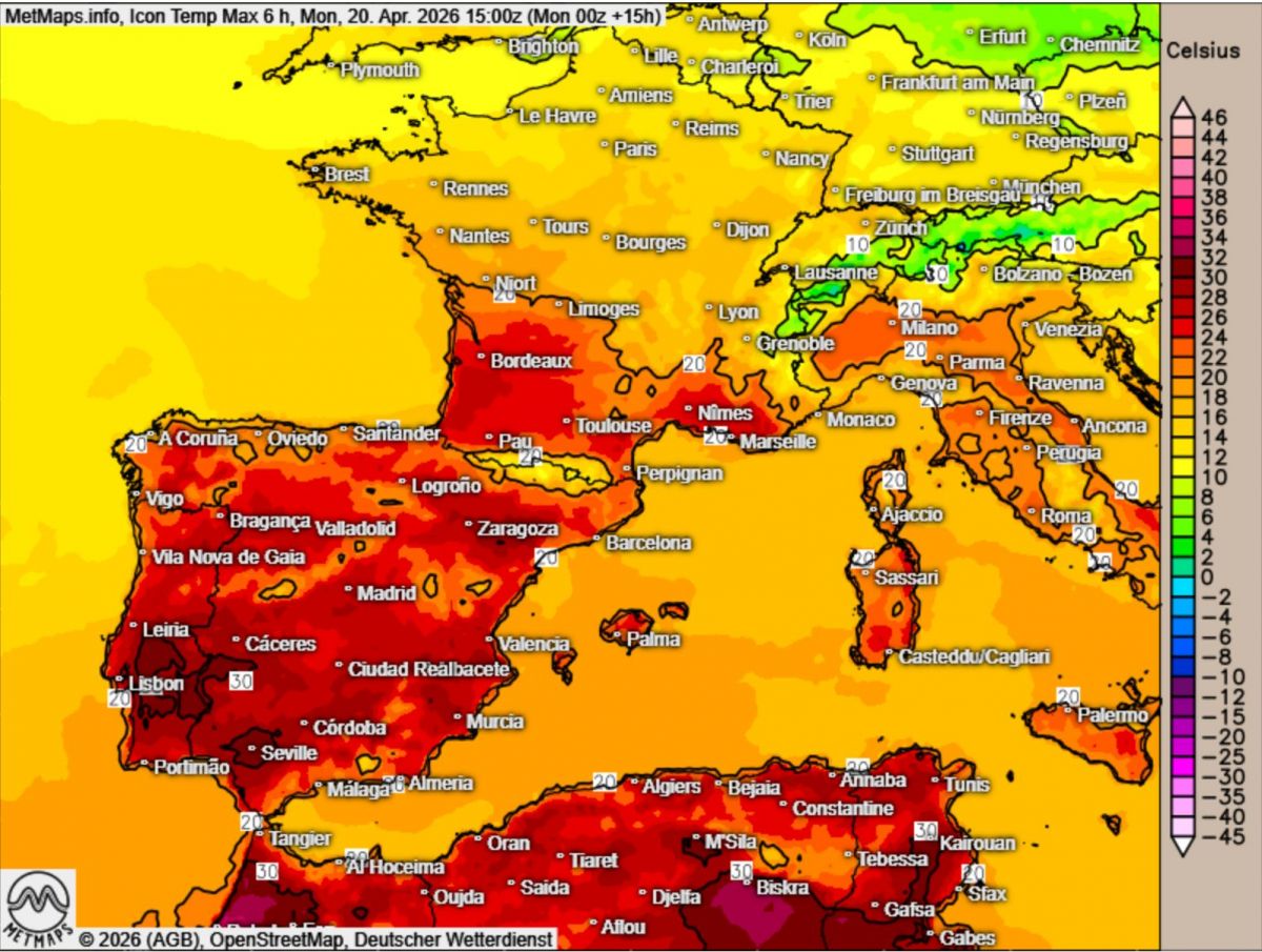 Ganz anders sieht es im Südwesten des Kontinents aus. In Spanien und Portugal stöhnen die Menschen unter der ersten echten Hitzewelle dieses Jahres. Die 30-Grad-Marke, die normalerweise erst im späten Mai oder Juni großflächig fällt, wird derzeit mühelos überschritten.
