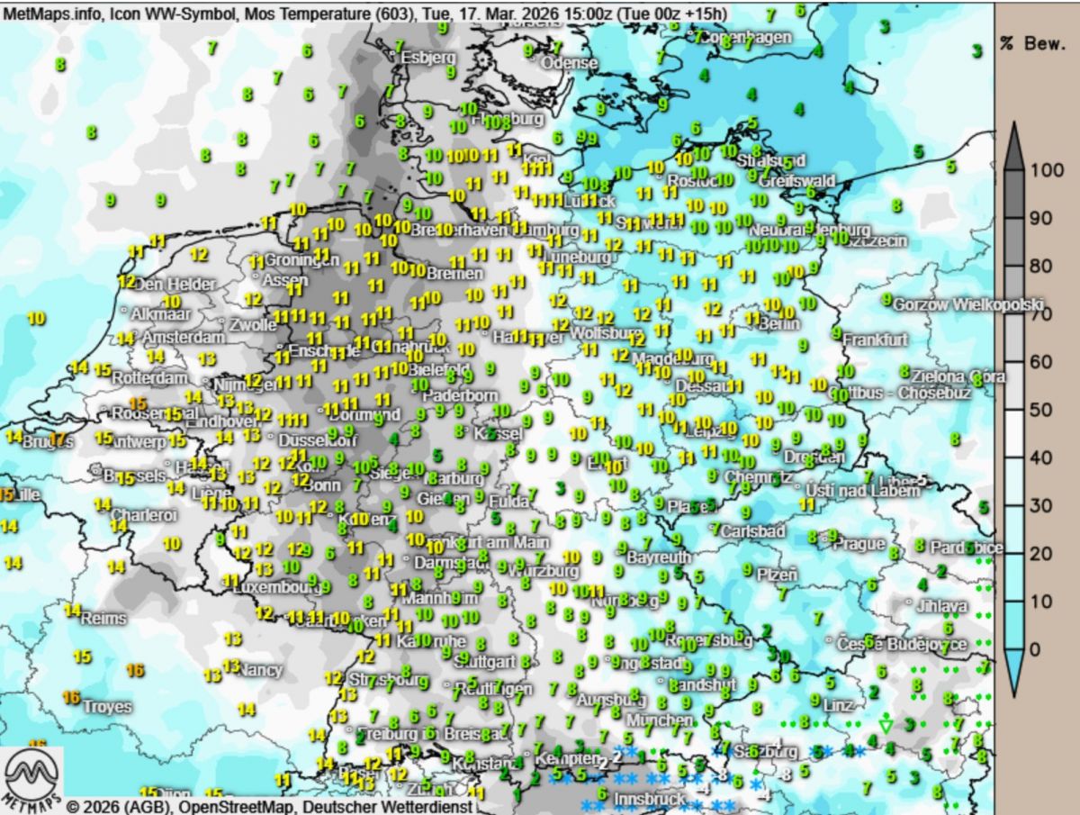 Deutschland präsentiert sich am Dienstag meteorologisch zweigeteilt: Während in der Westhälfte dichte Wolken dominieren und örtlich noch etwas Sprühregen fällt, zeigt sich das Wetter im Osten freundlicher. In Berlin etwa scheint bereits die Sonne bei trockenen Bedingungen.