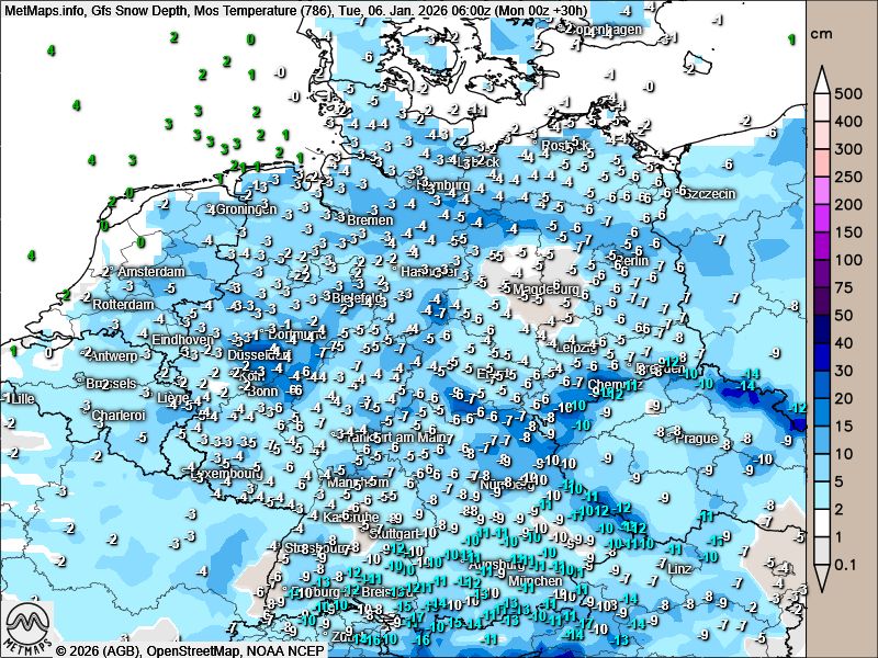 Die Karten bilden die Schneefalllage am Montagnachmittag und die Schneehöhe Dienstagfrüh ab.