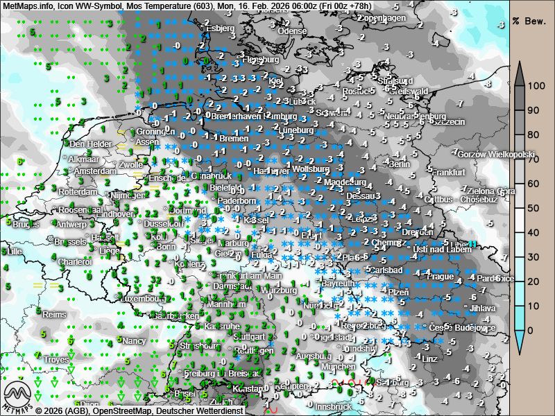 Wetter- / Temperaturkarte Deutschland, 16.02. (06:00 Uhr)