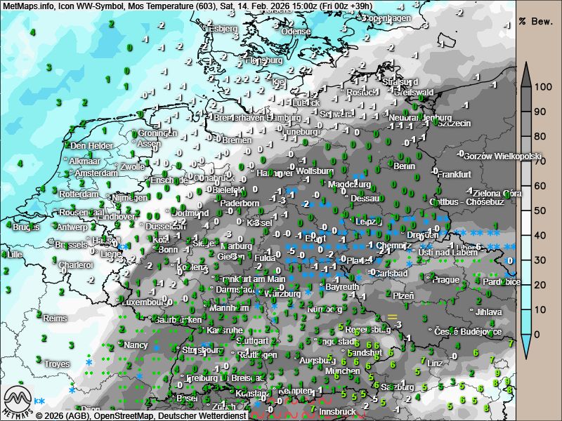 Wetter- / Temperaturkarte Deutschland, 14.02. (15:00 Uhr)
