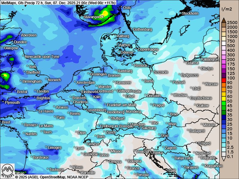 Während es bisher vorwiegend im Westen regnete, dehnt sich zum Nikolaustag der Regen auf das gesamte Land aus. Im Regenschatten der Mittelgebirge bleibt es nach Osten hin deutlich trockener.