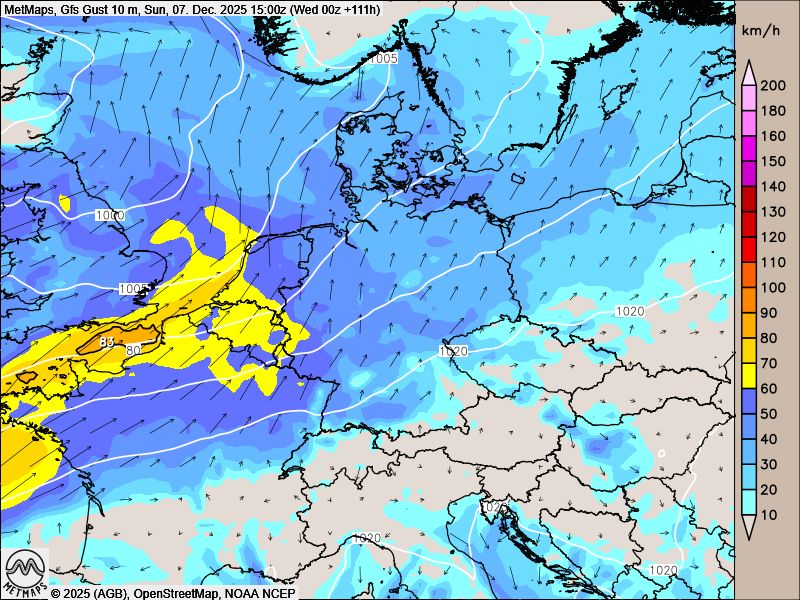 Die 72-Stunden-Regenmengen bis Sonntagabend sowie die Böenkarte für Sonntagnachmittag nach GFS: