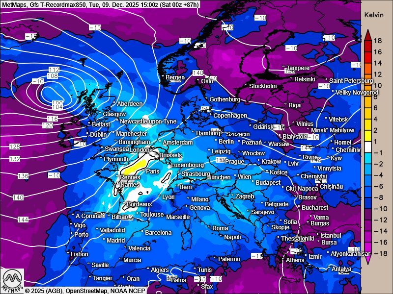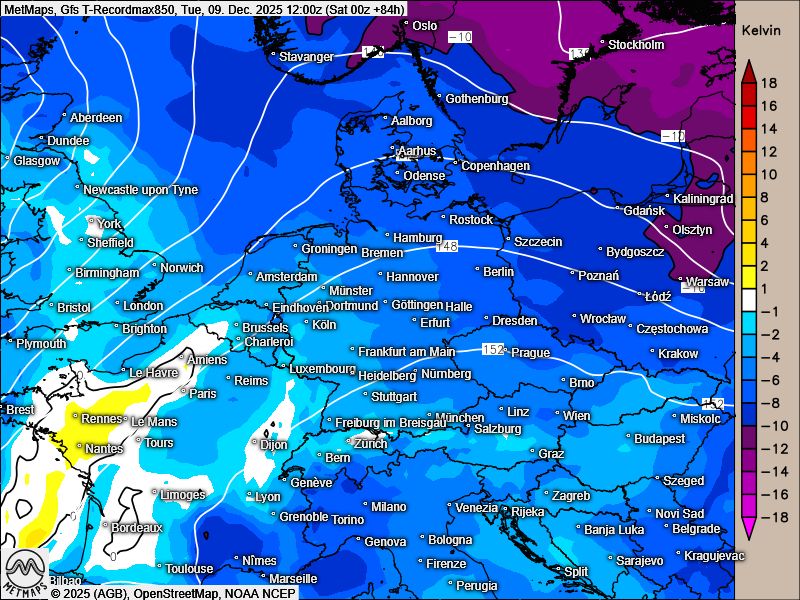 Zunächst erreichen die sehr milden Luftmassen Frankreich, dann die BeNeLux-Staaten, im Anschluss Deutschland, Schweiz und Österreich.
