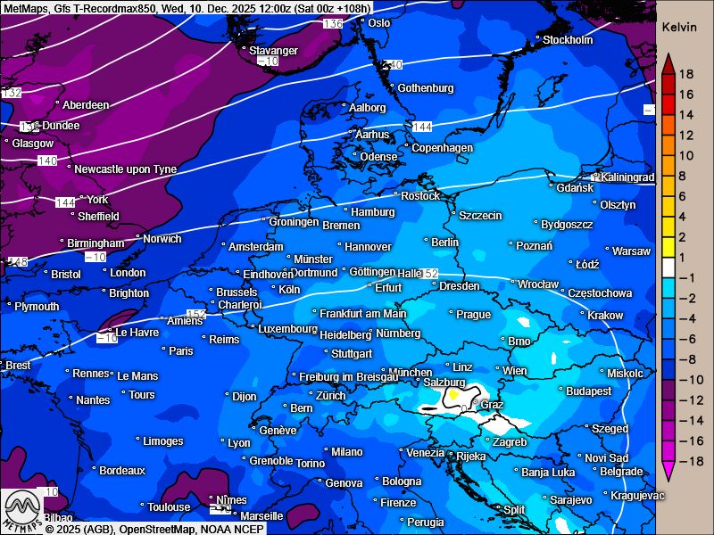 Die Karten bilden die Lufttemperaturen in 850 hPa (ca. 1.500 m Höhe) nach GFS für den kommenden Dienstag und Mittwoch ab: Die weißen und gelben Flächen zeigen dabei "Rekordwerte" an, welche noch nie in der Datenbank (mindestens 50 Jahre, vermutlich eher mehr) für diese Luftmassen berechnet wurden.