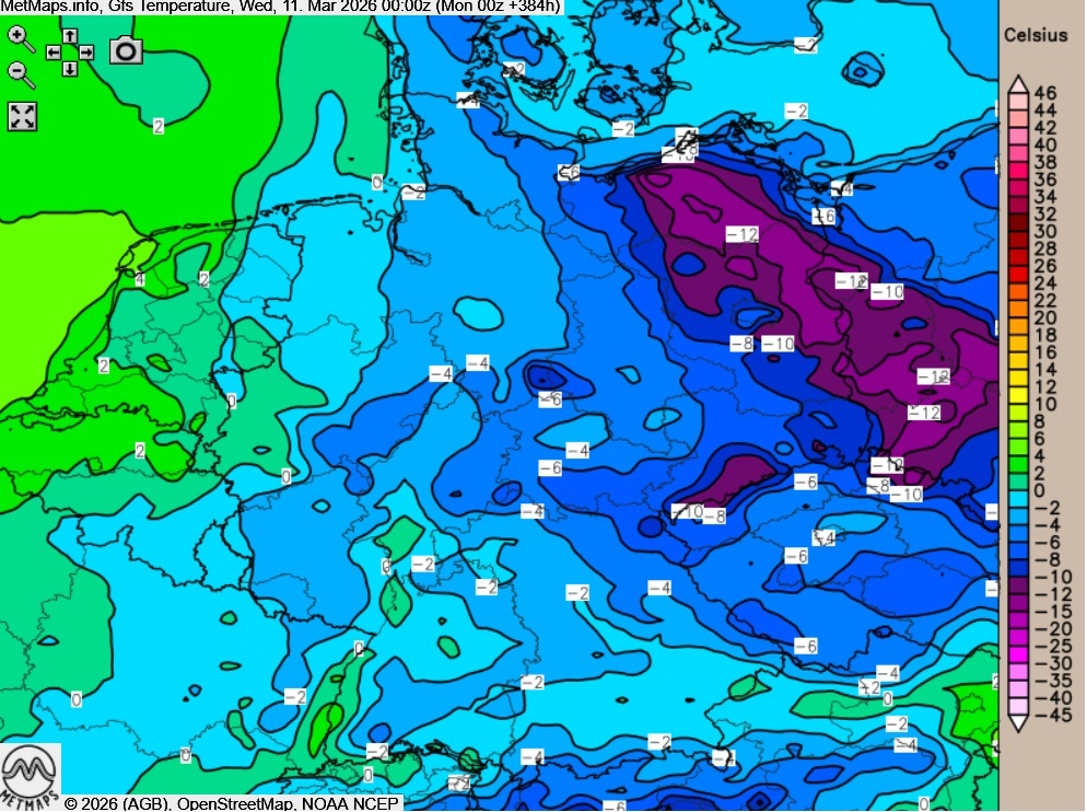 GFS-Temperaturmodell mit teils strengen Frösten am 11.03.