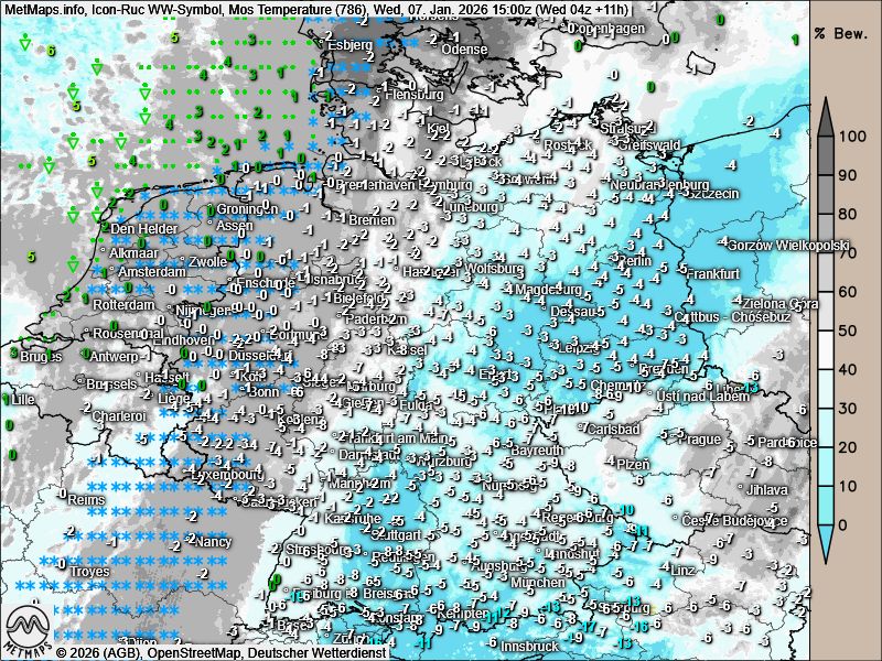 Wetter- / Temperaturkarte Mittwochnachmittag nach ICON-RUC